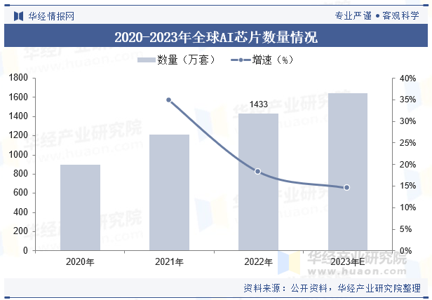 全球AI芯片数量环境呈现出逐年增加的趋向。智能安防、无人驾驶、智妙手机、聪慧零售、智能机械人等几大行业对AI芯片的需求不竭增加,鞭策了AI芯片市场的快速成长。据统计,2022年全球AI芯片数量为1433万套,同比增加18。2%;2023年AI芯片的数量将增至1640万套,同比增加14。4%。